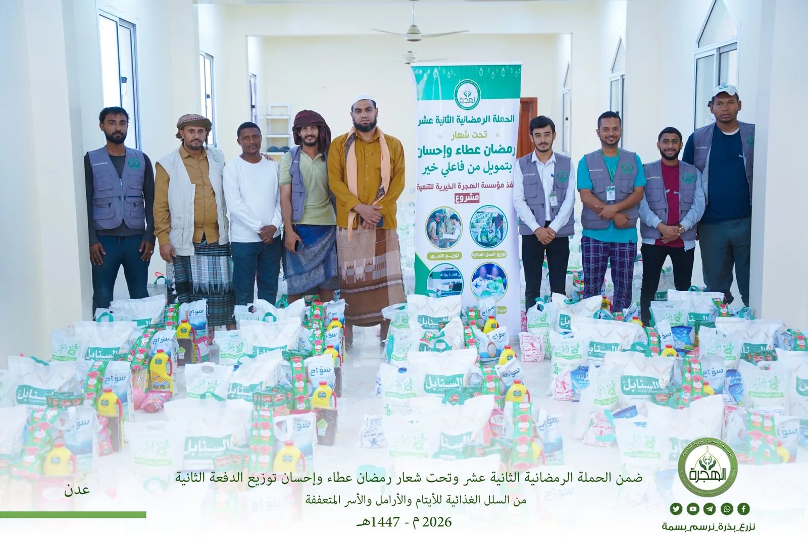 استمراراً في مسيرتها المباركة في العطاء نفذت مؤسسة الهجرة الخيرية للتنمية حملتها الإنسانية المباركة، صباح الاثنين ٢٨ شعبان ١٤٤٧هـ الموافق ١٦ فبراير ٢٠٢٦ م، ضمن الحملة الرمضانية الثانية عشر، وتحت شعارها النبيل (رمضان عطاء وإحسان)، الدفعة الثانية من مشروع توزيع السلال الغذائية، بتمويل من فاعلي خير، مستهدفةً الأيتام والأرامل والأسر المتعففة ومدرسي حلقات المساجد ، في مشهدٍ تتجلى فيه معاني التكافل والتراحم التي حثّ عليها ديننا الحنيف.