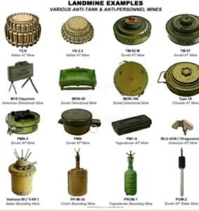 * انـواع الألغام : كافة الألغام المضادة للآليات والافراد . كما ينبغي استخدام المواسير ( شد ، قطع شد وغيره ) والتفخيخات على انواعها .